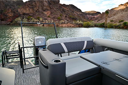 Judge Bill Gius said, “Keeping aft seating passengers secure and comfortable, the Bennington Retractable Keeper Rail is now available on several models. The high polish, stainless steel rail and linked chain system easily clicks into place for running underway or slides out of the way with the operation of three locking pin sets, to allow for easy access on or off the aft lounge and voluminous swim platform area.”